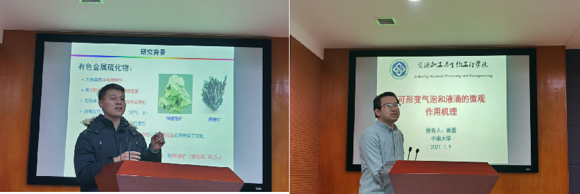 特聘教授谢磊以《可形变气泡和液滴的微观作用机理》为题,阐述了原子力显微镜探针测力技术在揭示浮选过程中气泡与液滴微观作用机制方面的应用,并鼓励研究生加强学术交流与合作。