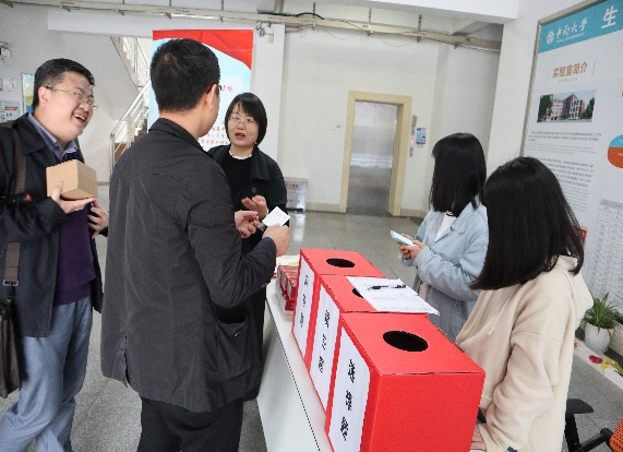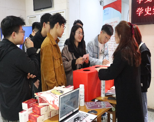 活动在生物楼与和平楼大厅开展,现场设置选择、填空、问答三种题型,分别放置于三个抽题箱中,每人有10次答题机会,完成第一关可获得三等奖、第二关可获得二等奖、第三关可获得一等奖。题目涵盖了我们党从诞生到发展的相关内容,考验师生对党史知识的了解程度。在答题过程中,每位参赛师生都全神贯注、积极思考,答题现场非常火热。