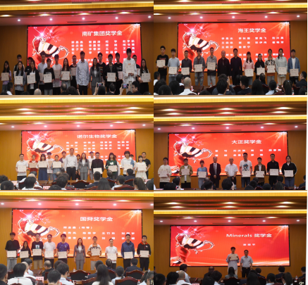 院长覃文庆教授现场宣布了表彰决定。郭晶晶等34人获得南矿集团奖学金,李昱达等19人获得海王奖学金,焦颖等23人获得诺尔生物奖学金,章可等7人获得大正奖学金,邢金鑫等9人获得国舜奖学金,谢顺平获得Minerals奖学金。颁奖嘉宾依次为获奖学生颁发证书并合影留念。
