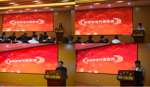 南矿集团奖学金获得者傅楠,海王奖学金获得者李秋雨,诺尔生物奖学金获得者张奥奇,大正铝业奖学金获得者俞景峰四位同学作为获奖学生代表发表感想。他们首先表达了对设奖企业和学校的感谢,表示会继续保持追求进取的精神。获奖不是结束,而是开始,在未来要成为有责任感,对社会有贡献有帮助的杰出新时代栋梁。