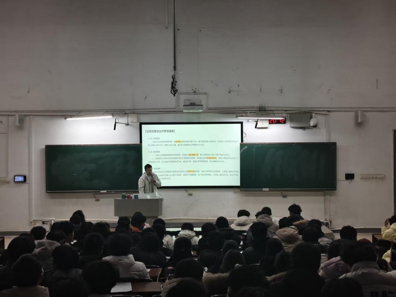 1月8日晚,为进一步强化思想引领,提升安全意识,规范学风考纪,学院组织召开本科2025级“筑牢底线红线 护航成长之路”主题年级大会。会议围绕安全教育、诚信应考教育两大核心内容展开,由本科2025级辅导员胡煊赫主讲。