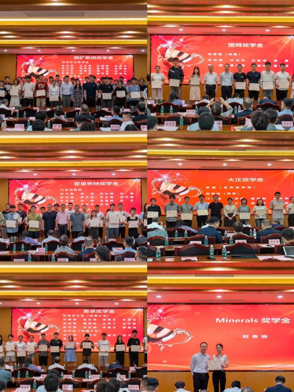 范晓慧现场宣布了各项奖励金获奖师生名单。邵志东等35名同学获得南矿集团奖学金,宋庆峰等9名同学获得国舜奖学金,吴望妮等20名同学获得霍里思特奖学金,李骞老师获得大正优秀教师奖,邝子扬等9名同学获得大正优秀学生奖,唐翊歆等20名同学获得美卓奖学金,赵春晓同学获得Minerals奖学金。
